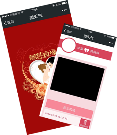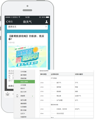 微生活提供微信公眾號自定義菜單管理功能,用戶無需再通過輸入關鍵詞觸發(fā)回復,直接點擊菜單就可以看相關的內(nèi)容,微生活可與Wap進行打通,復用APP原有功能,同時可定制個性化功能、使用HTML5新技術(shù)進行無限拓展,幫助地方氣象部門打造最便捷、易推廣的微信內(nèi)置APP,此功能如果結(jié)合微信3G網(wǎng)站可以使您的公眾號用戶體驗更好,帶給粉絲不一樣的感受。