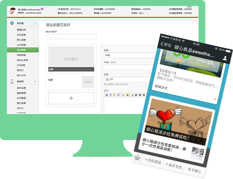 微生活素材管理與微信公眾平臺素材管理完全融合,操作一致,擁護可以非常方便的將自己的多圖文信息上傳至微生活平臺進行管理。