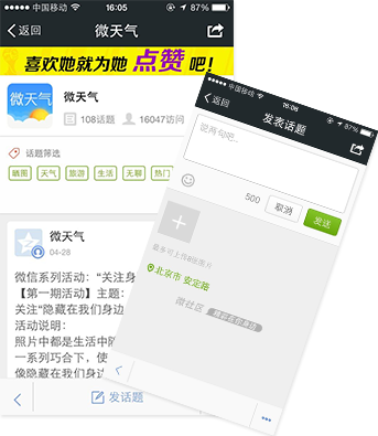 人人都是微話題制造者。近期熱門話題、個人興趣、網(wǎng)友討論多種渠道內(nèi)容,經(jīng)過編輯發(fā)布,就可進入該頁面發(fā)布信息進行討論交流。增強用戶活躍度,吸引用戶。
