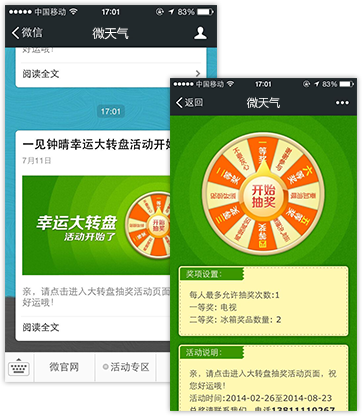 我們將利用微信的強交互性,讓您通過對互動流程、環(huán)節(jié)和方式的設計,運用各種設計活動從而實現(xiàn)與用戶的互動交流,整合系統(tǒng)互動符合微信娛樂性強的產(chǎn)品本質(zhì),用戶可結(jié)合自己的有效資源發(fā)起抽獎活動,以增加用戶黏性。